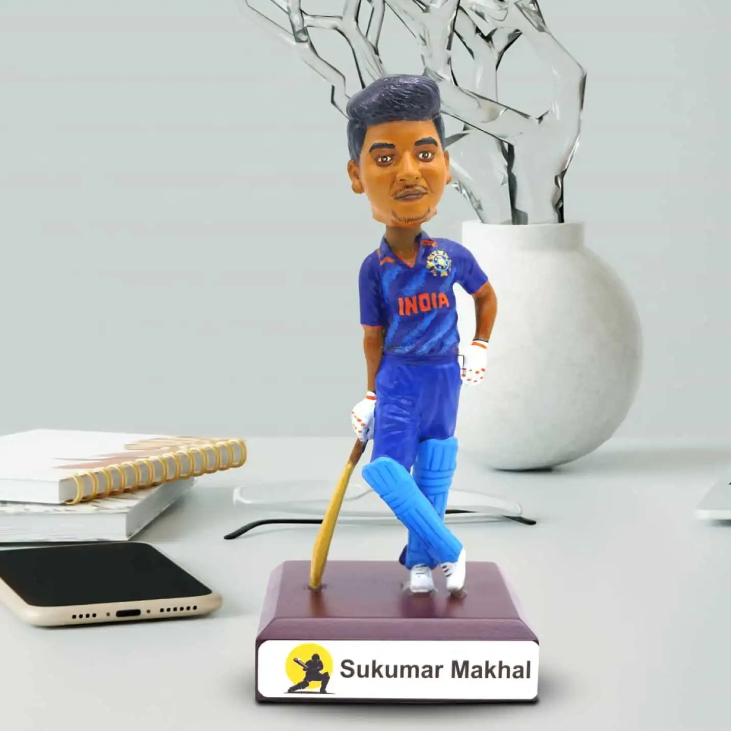 You can create personalized miniature gifts by adding the recipient's photo, name, and favorite cricket style (pose, bat, uniform). This gift is perfect for birthdays, achievements, or sporting events. Presto's customization service is clearly visible in this miniature's design, making it a unique keepsake for your loved one. This tiny personalized gift is not only visually appealing but also sure to last.