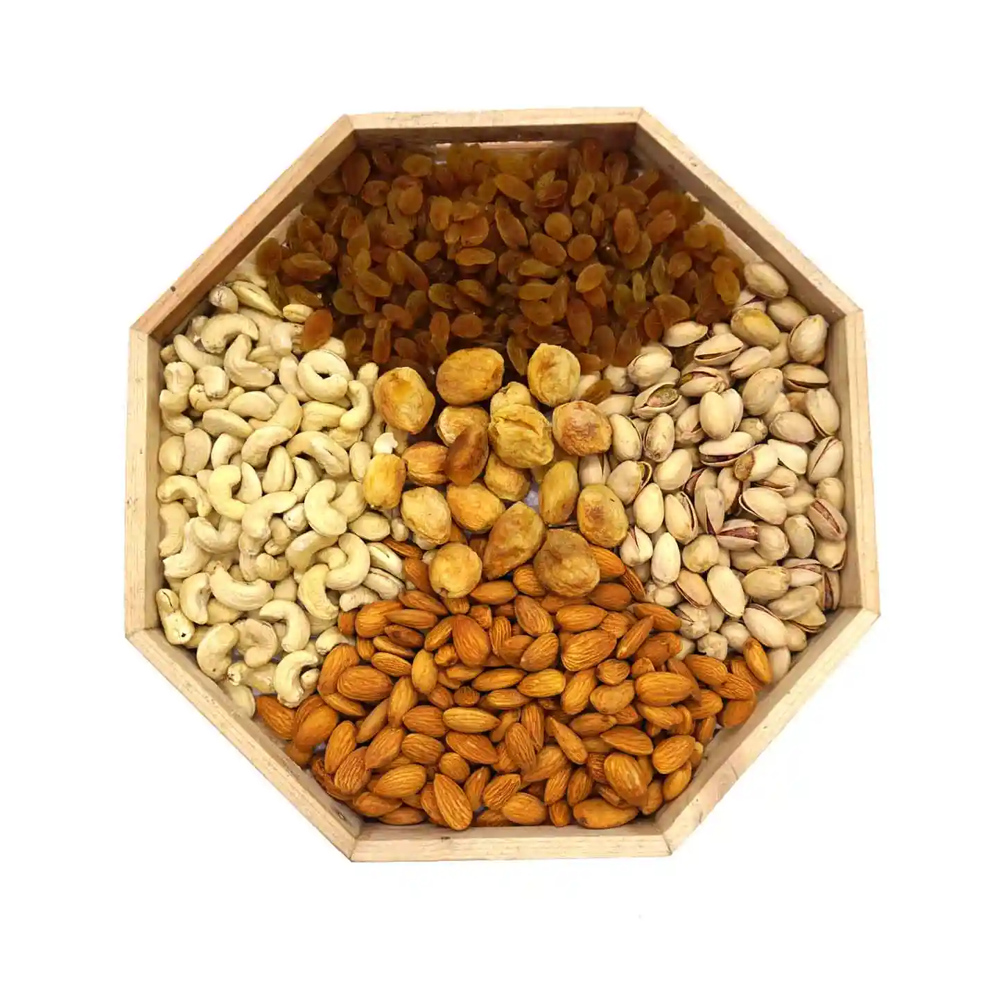 Don’t worry, it is a decorated tray. On this tray, you will get dried apricots, raisins, cashews, almonds, and pistachios.