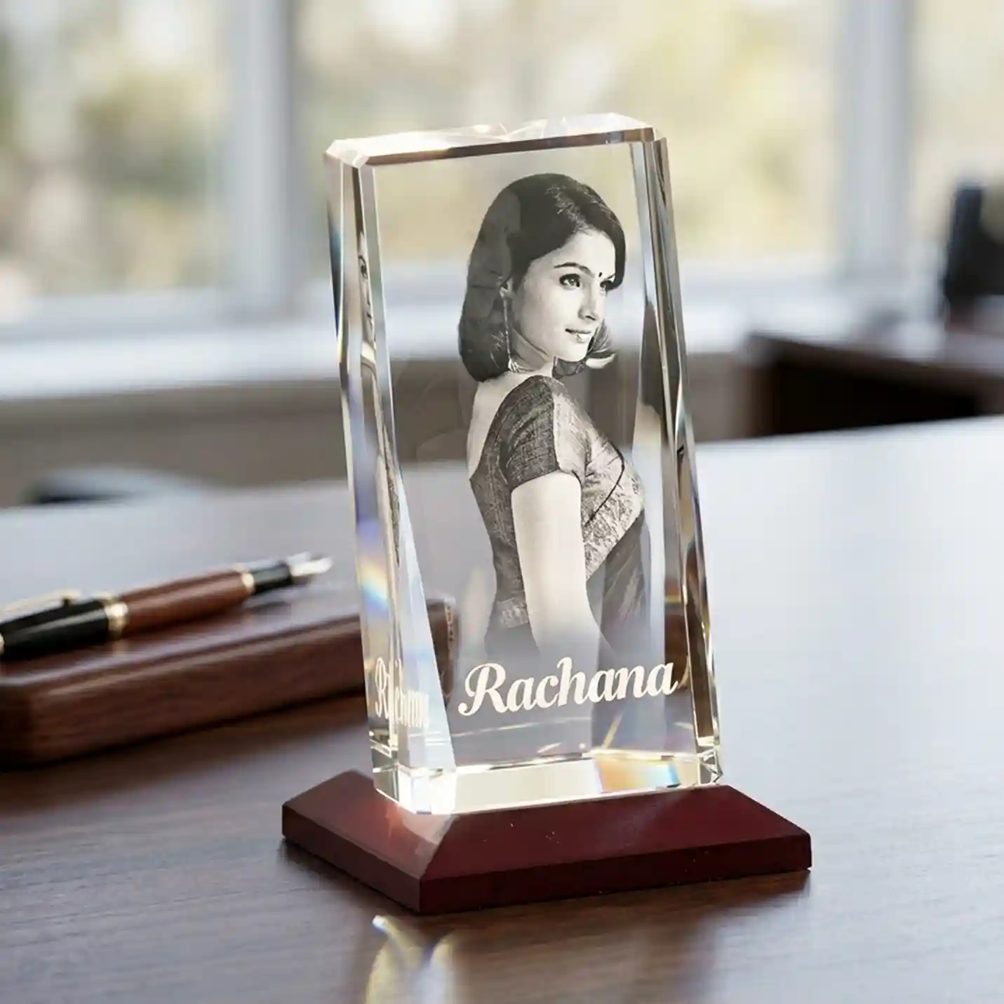 This crystal design tapers gracefully offering an elegant dimension to your gifting.Perfect way to express your love with a classy 3D crystal that remains special in the heart of the recepient. The crystal comes along with a complimentary LED light base.Presto uses top quality K9 Quality Crsytals that are absolutely clear. The picture provided by you will be Laser Engraved in 3D. Its like capturing the person within the Crystal. The LED Light base can be connected to any power source. Just place the Crystal on the LED Light base and see the magic unfold. A truely top class Personalised gift. And feel free to add some small text that you may like.