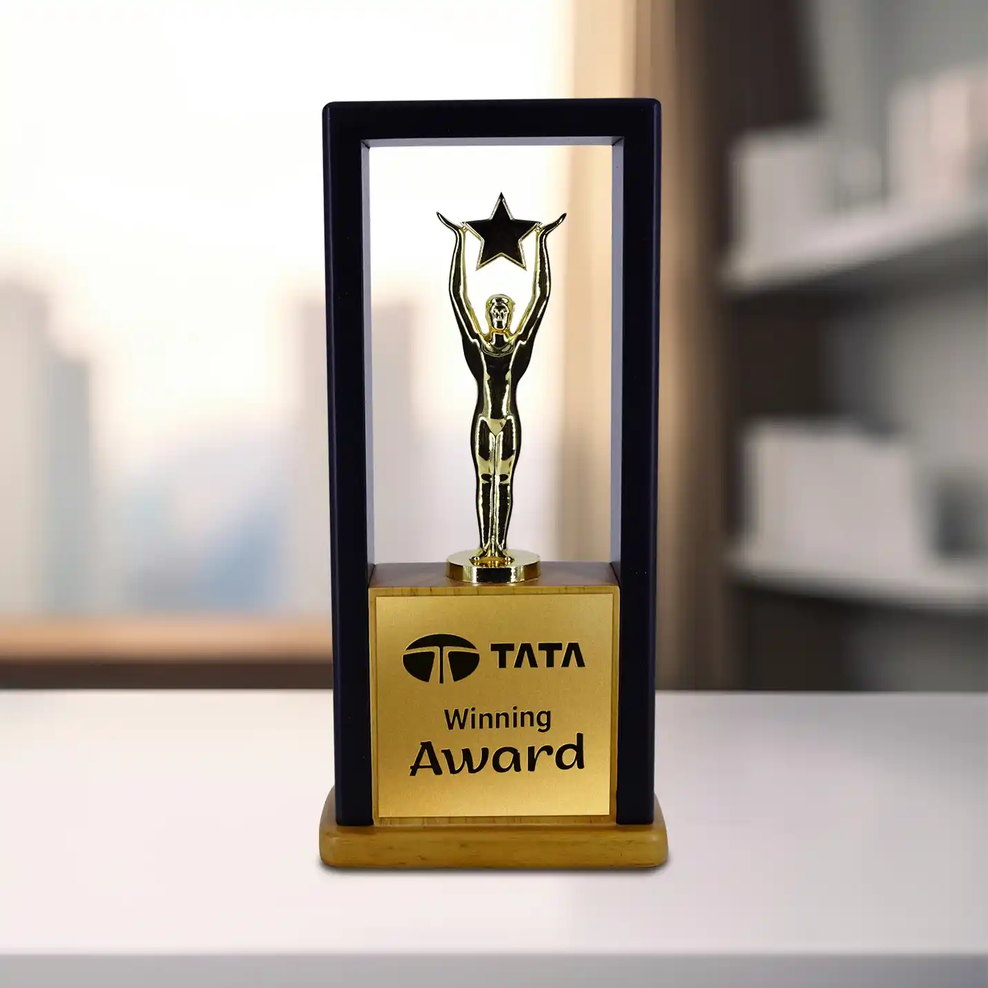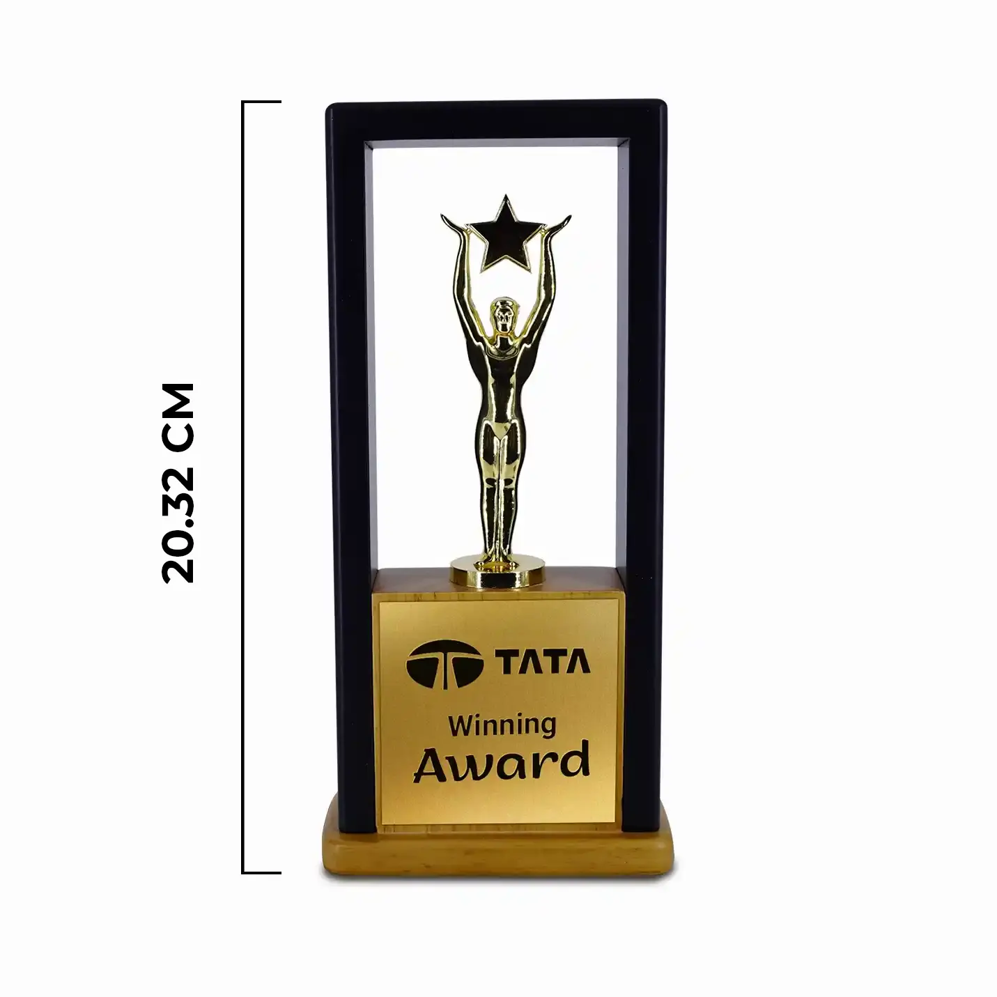 Custom bulit Wood Trophy with Metal Statue - 20.32 X 11.43 CM