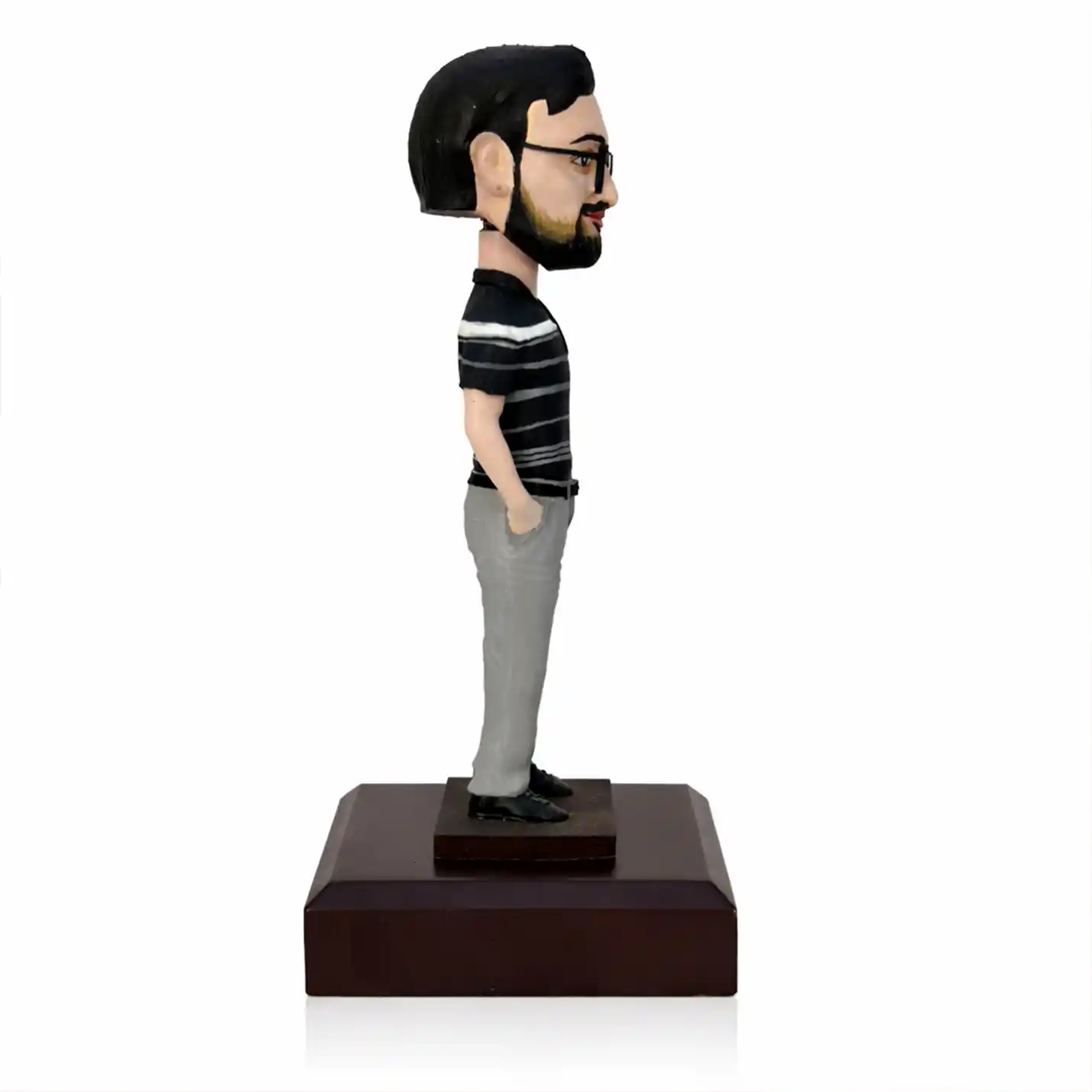 Presto's Personalised Bobblehead is a premium hand-sculpted, hand-painted miniature figurine crafted by our skilled artists. All we need from you is a clear front-facing photograph — and we'll do the rest! The head is mounted on a spring and bobbles playfully upon the slightest touch, making it a delightful keepsake or conversation starter. The body pose is prefixed as shown in the product images. Each figurine is mounted on a rich wooden base engraved with your personalised message, name, or any text of your choice.