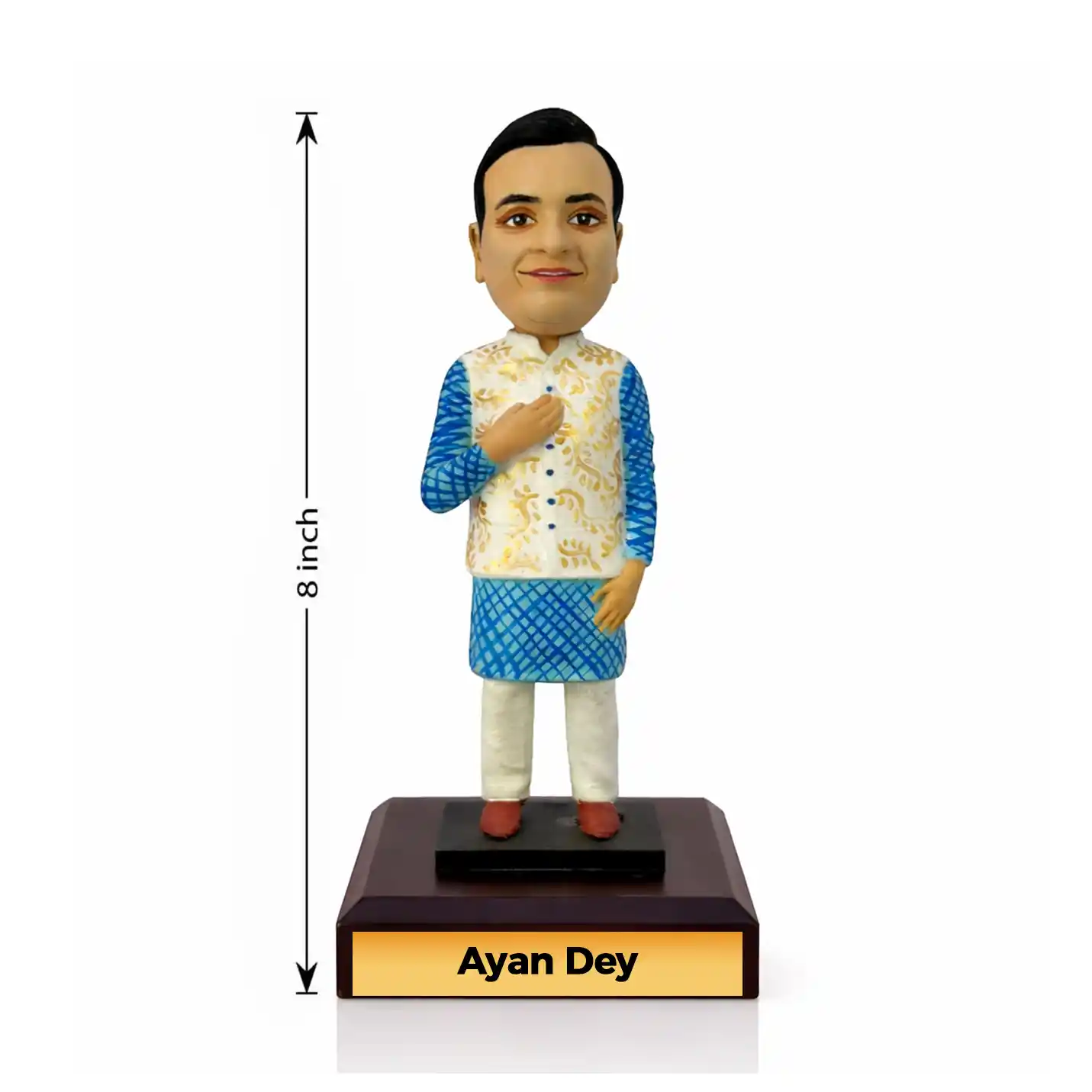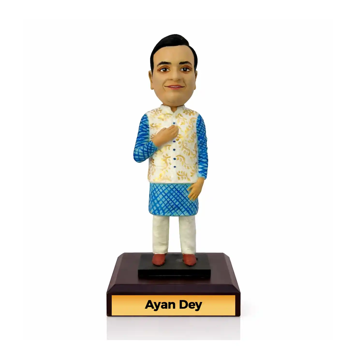 Presto's Personalised Bobblehead is a one-of-a-kind, hand-sculpted and hand-painted miniature figurine crafted exclusively from your photograph. Each piece is a bespoke work of art — meticulously detailed by our skilled artisans to capture the unique likeness, style, and personality of the person being gifted. The oversized bobbling head is mounted on a spring, so it wiggles and wobbles with the slightest touch — bringing a smile every time! The figurine stands proudly on a rich wooden base, finished with a personalised gold metal nameplate carrying any message, name, or dedication of your choice.