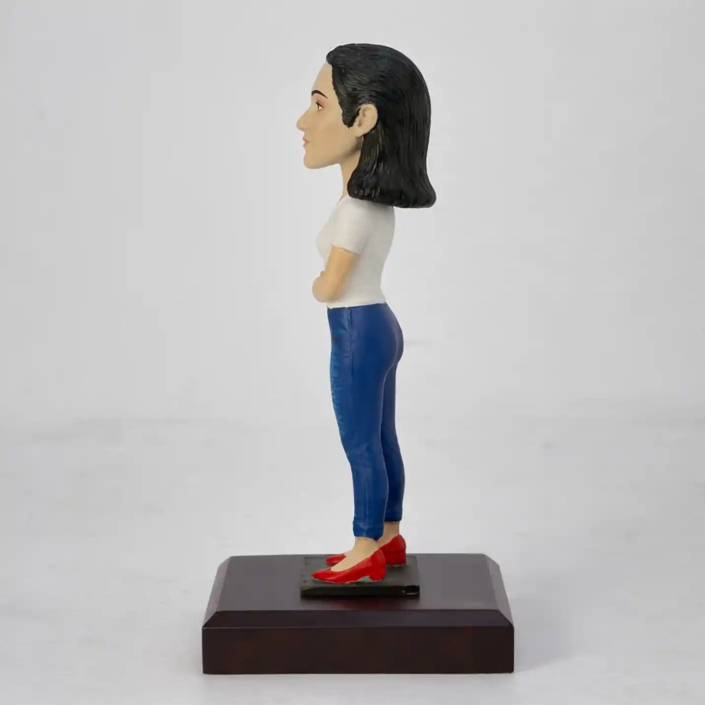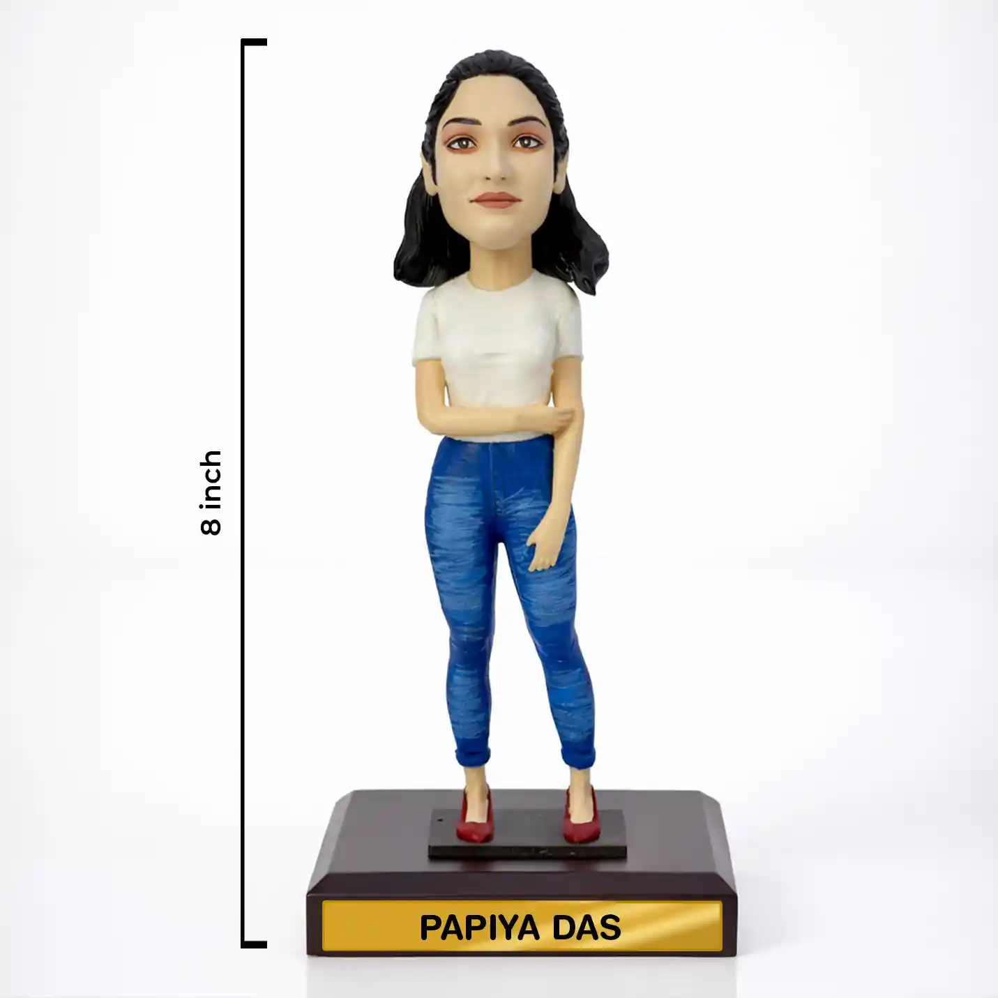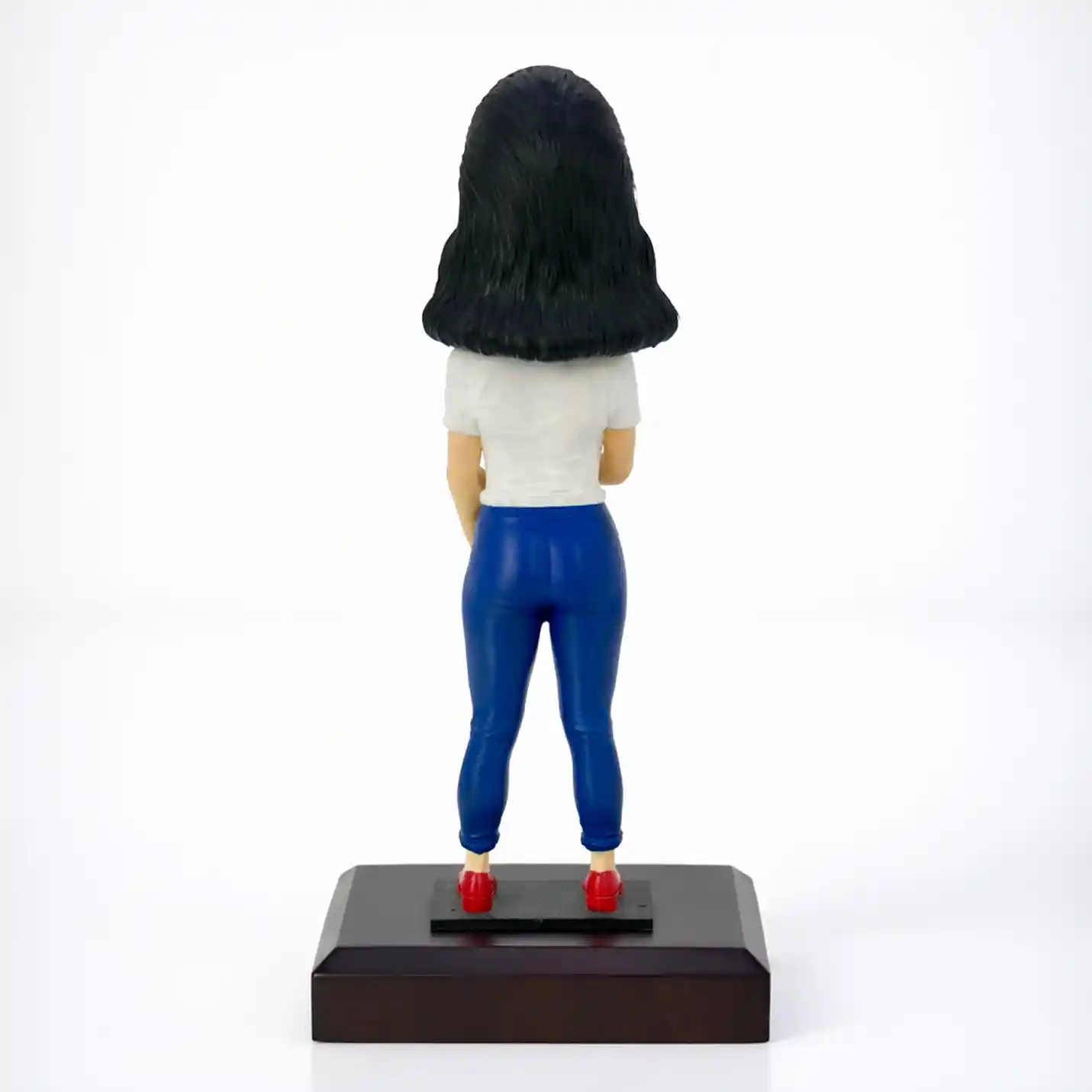 Presto's Personalised Bobblehead — Modern Casual Edition — is a hand-sculpted, hand-painted miniature figurine crafted by our talented artisans. Dressed in a stylish white t-shirt, blue denim jeans, and classic red heels, this doll perfectly captures the spirit of the confident, contemporary woman.