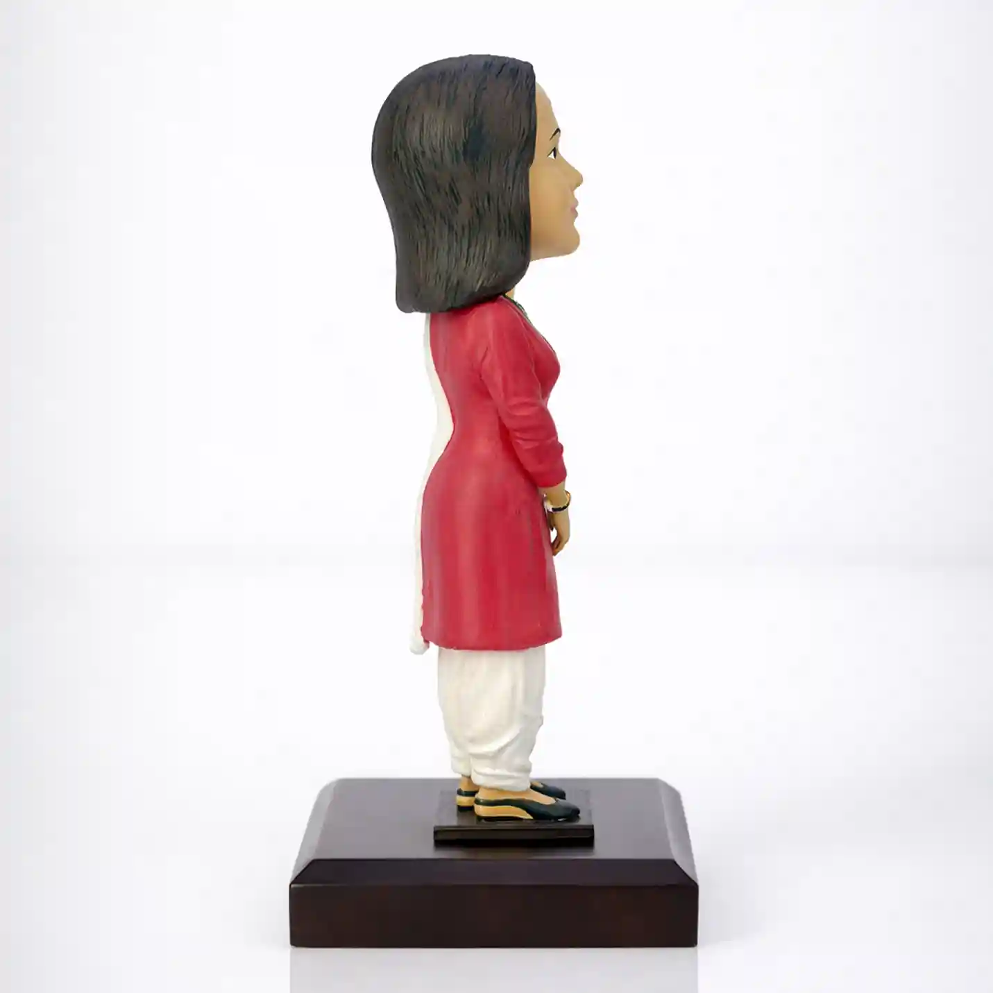 All we need from you is a clear front-facing photograph. Our artists meticulously sculpt and paint the facial features to closely resemble the person in the photograph. The head is spring-mounted and bobbles playfully upon the slightest touch. The body is prefixed in the traditional kurti-salwar style as shown in the product images. The doll stands elegantly on a premium wooden base bearing a gleaming gold metal name tag — personalised with any name, message, or text of your choice.