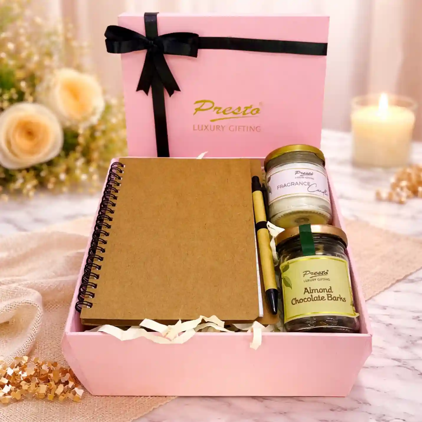 The notebook and pen invite you to slow down and put your thoughts on paper, while the scented candle adds a warm, relaxing ambiance to your space. Paired with indulgent almond chocolate treats, it creates a perfect little escape from the everyday rush.