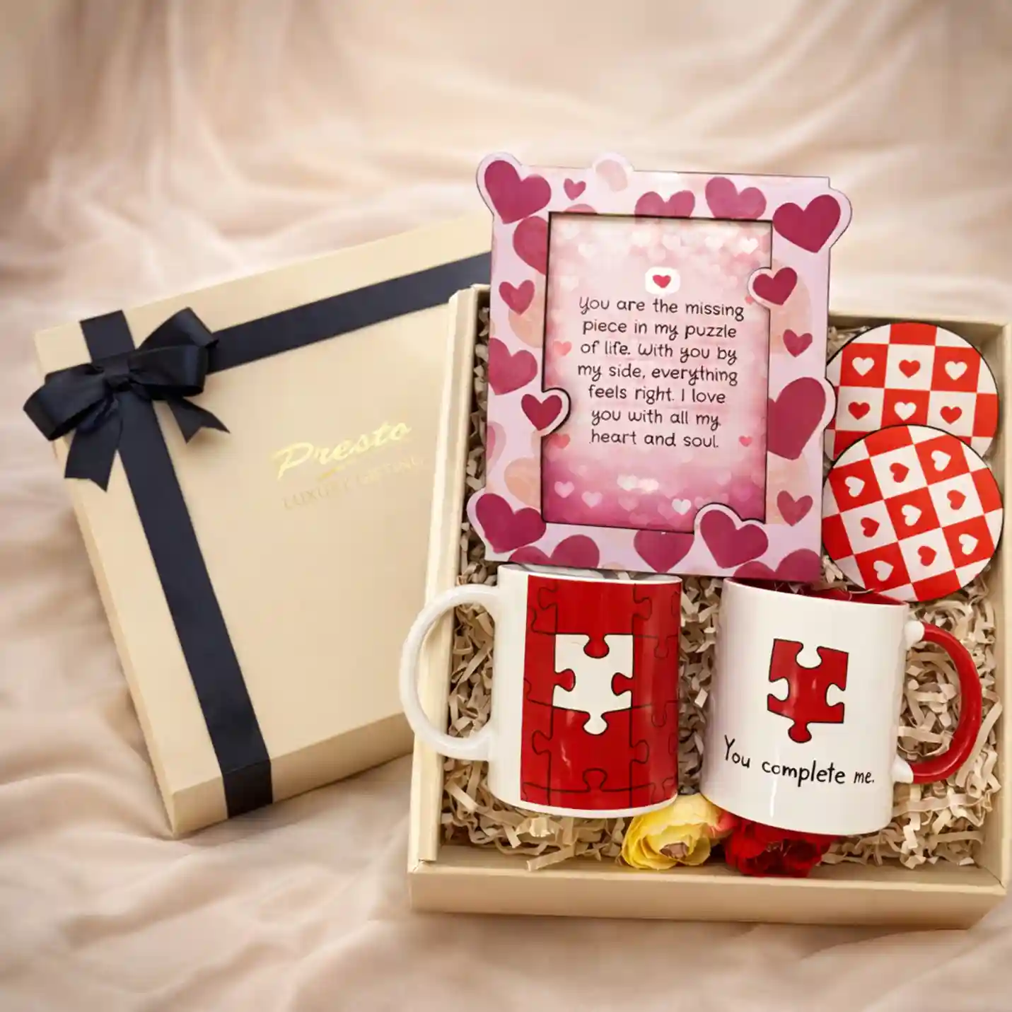 This thoughtfully curated romantic hamper celebrates the beautiful idea of two people completing each other. The matching puzzle-print mugs symbolize a bond that fits perfectly, making every coffee moment feel a little more special. Paired with a heartfelt photo frame to capture your favorite memory and charming coasters to complement the set, this hamper is all about meaningful gestures.