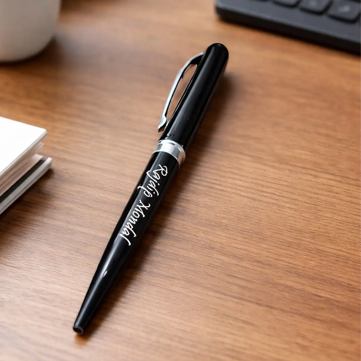 The pen is personalised with high-quality laser engraving. Mostly ordered with the Name of the recipient, you may also include a small message if space permits. The Wooden Pen box allows more space to write. You may also include other details, like a Logo.