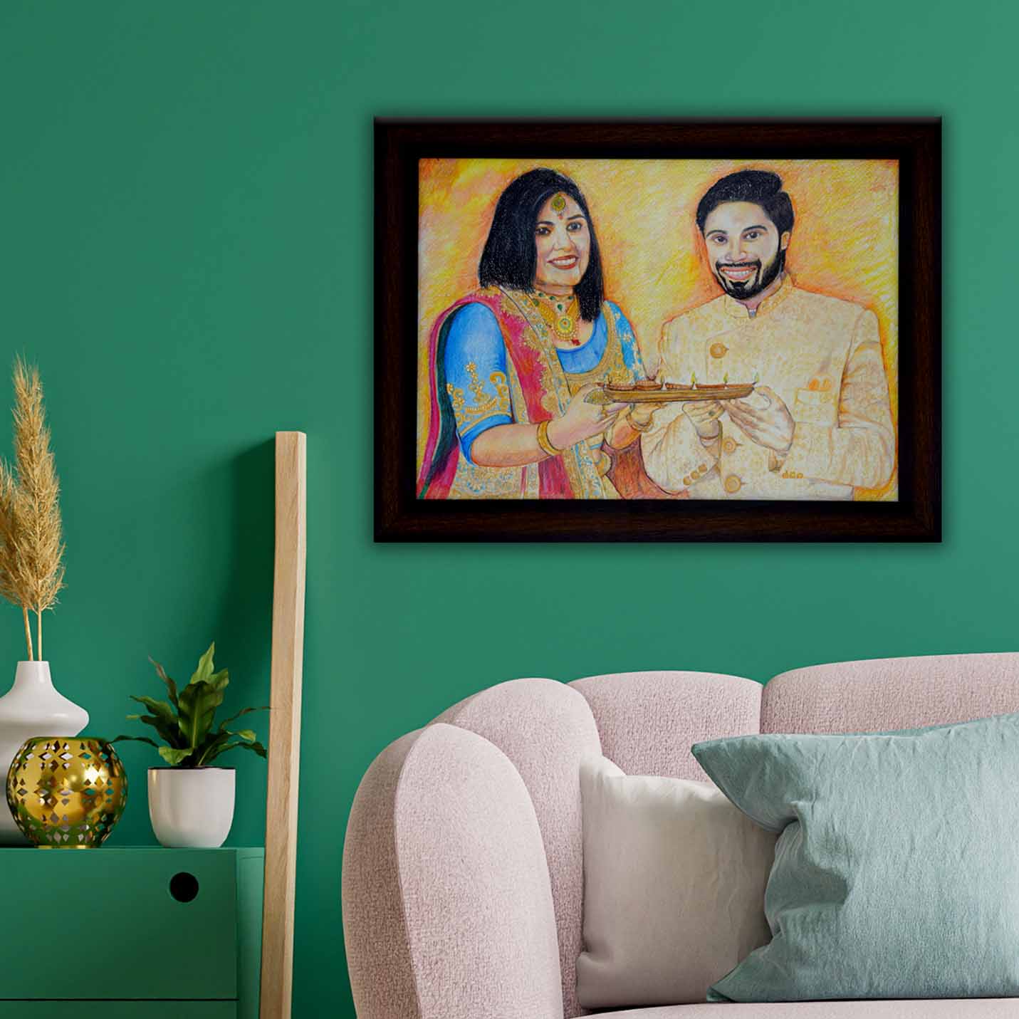 Colored Hand Sketch with Wooden Frame for Couple