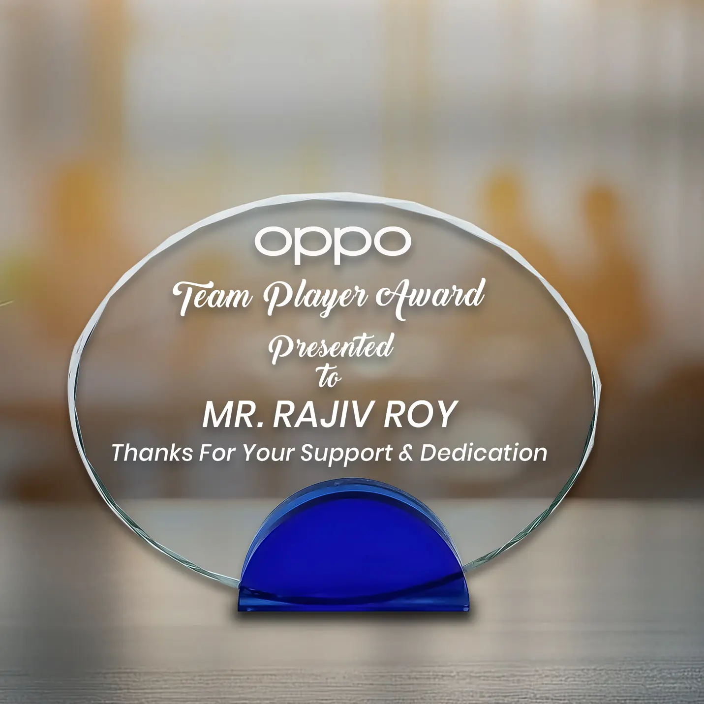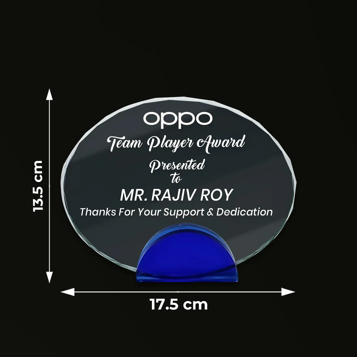Crystal Memento in Oval shape, Size 17.5 x 13.5 cm . Matter is Personalised using Sandcarving Technology giving that engraved feeling on Crystal.Suitable for Logos and text.
