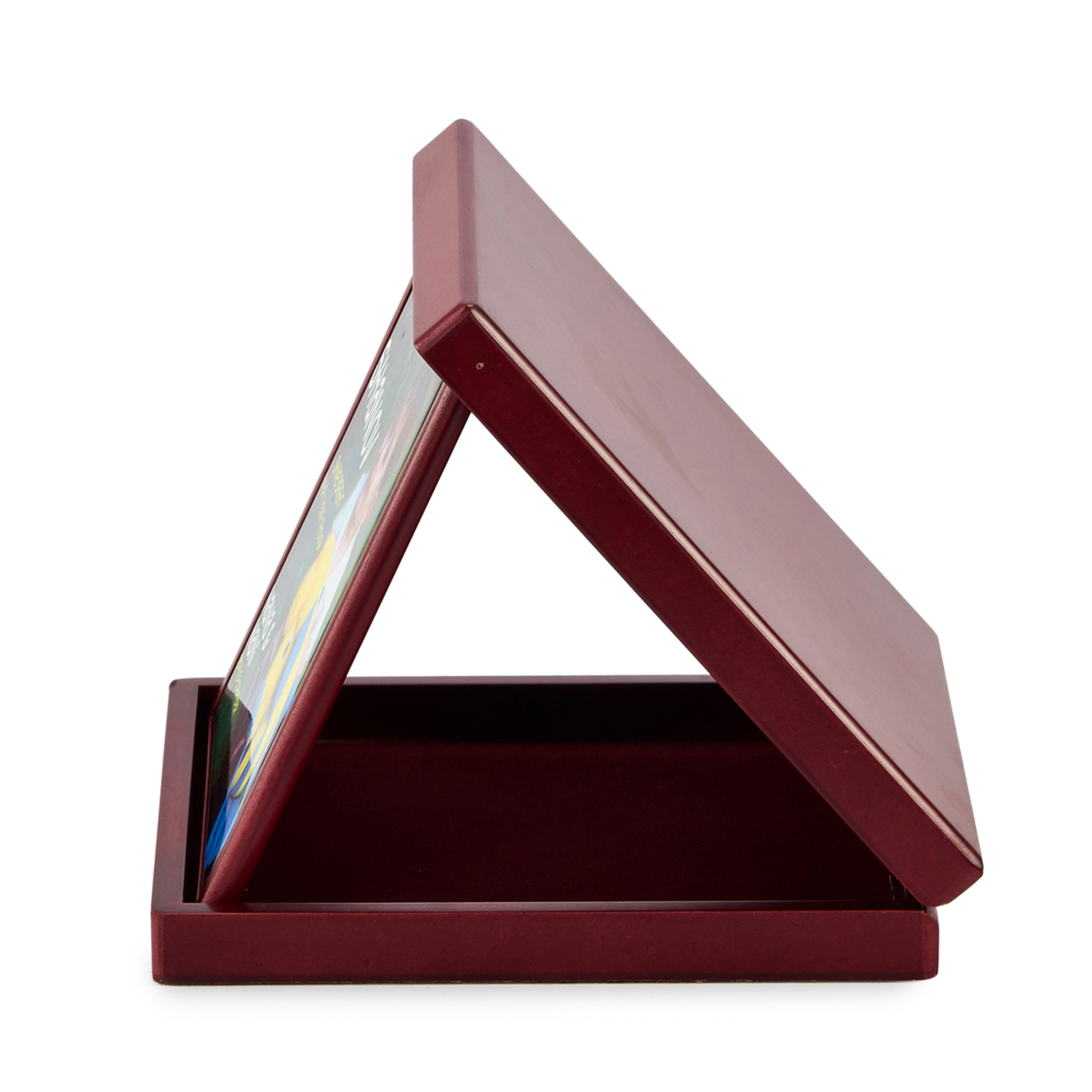 Sublimation printed ceramic tile in a foldable wooden jewel box makes for an elegant Gift. Have the matter of your choice printed. Upload any picture and text that you want. Our designers will make the design and send it to you for approval. The product will be made only after your approval so you are guaranteed to receive what you liked. The Jewel box can be kept open or closed as you deem fit.
